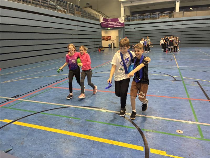 An weiteren Stationen konnten die Klassenteams ihre Koordination, Treffsicherheit und Ausdauer unter Beweis stellen. Bei dem Spiel Hühnerleiter war eine gute Spielübersicht entscheidend. Bei den Korbwürfen kam es auf Konzentration und Zielgenauigkeit an und in der Laufstaffel zeigte sich, welches Team besonders ausdauernd und geschickt zusammenarbeitete. Begleitet von Karnevalsmusik herrschte in der gesamten Halle eine ausgelassene Stimmung. Zahlreiche Schülerinnen und Schüler kamen in ideenreichen und liebevoll gestalteten Kostümen und verliehen der Veranstaltung damit eine besonders farbenfrohe und fröhliche Atmosphäre. Am Ende des gelungenen Tags wurde das coolste Karnevalskostüm mit einem riesigen Klatschapplaus gekrönt. Ein besonderer Dank gilt unseren Sportlehrkräften und Sporthelfern, die die Organisation und Durchführung dieses Tages ermöglicht haben. Ebenso bedanken wir uns herzlich bei der Schwalbe Arena, dass wir unser Sport- und Spielefest erneut dort veranstalten durften.