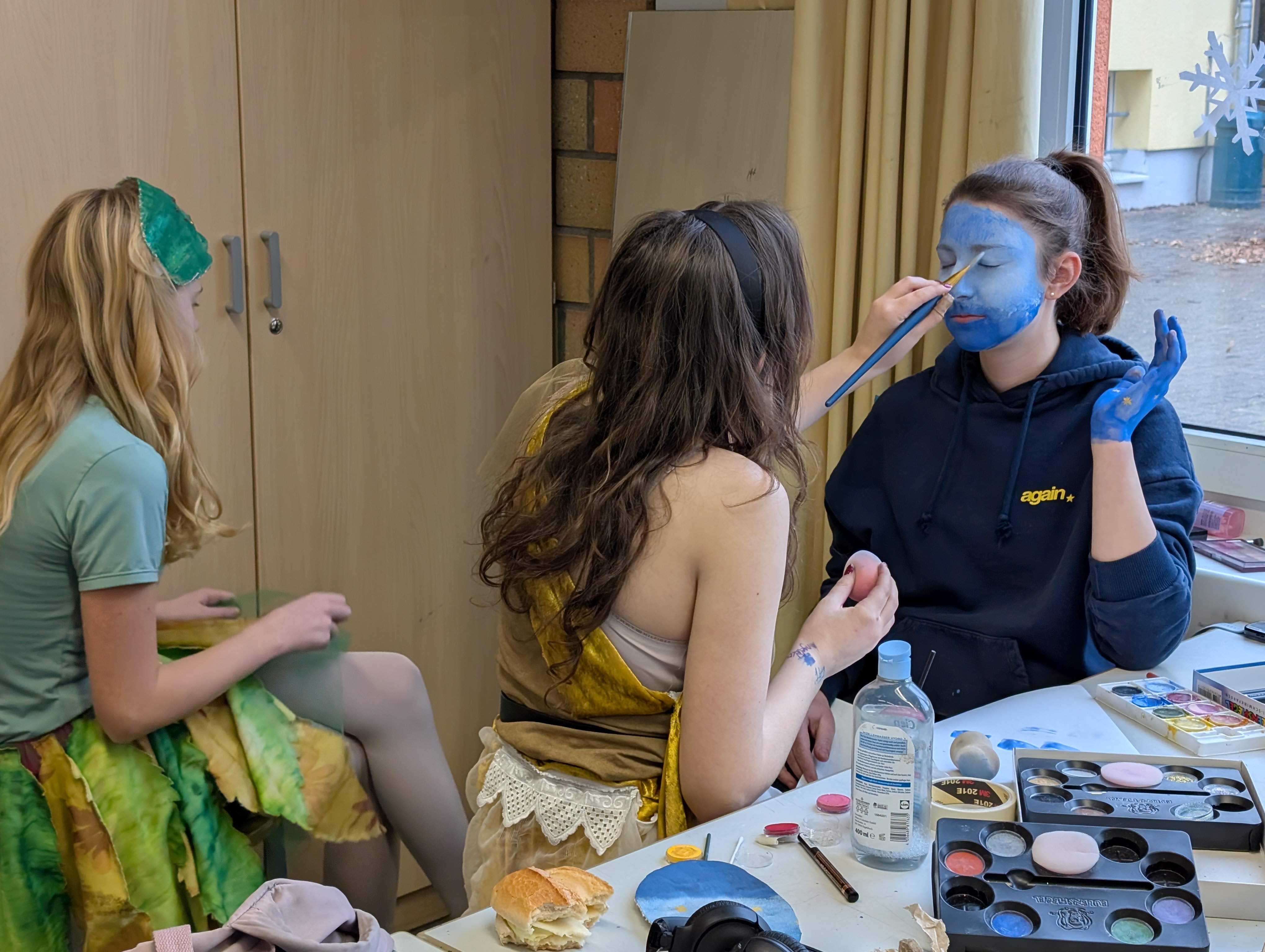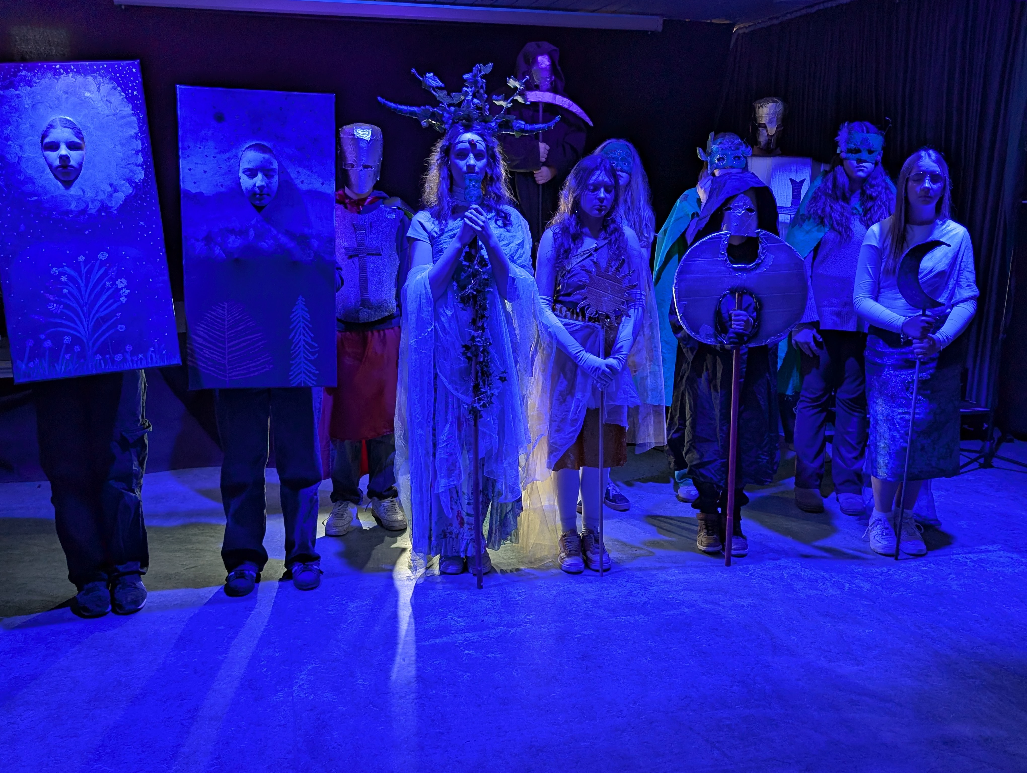 Die zweite Gruppe unter der Leitung der Kunstlehrerinnen Dudszus und Daugy sorgte dafür, dass der Schatz zusätzlich durch Wächter bewacht wurde. Es entstanden lebendige Kunstwerke: Gemälde, Krieger und Elfen, denen der für sie bestimmte Portschlüssel in die ausgestreckte Hand gelegt werden musste, um den Weg zur Maschine freizugeben.